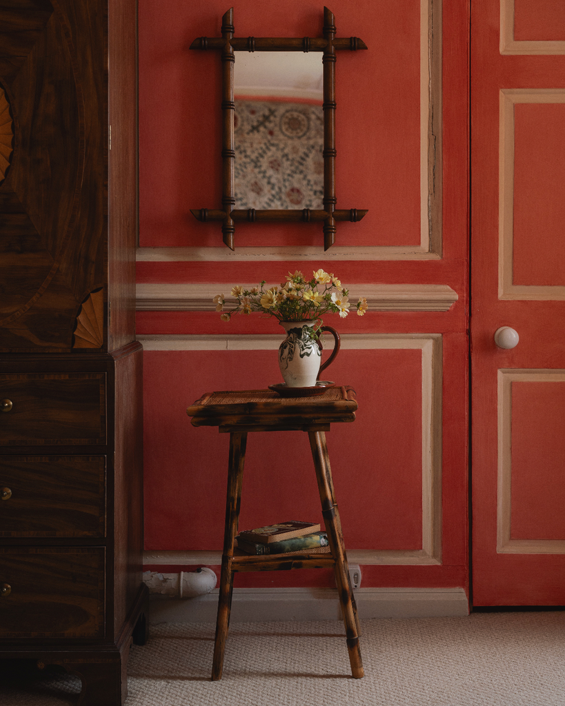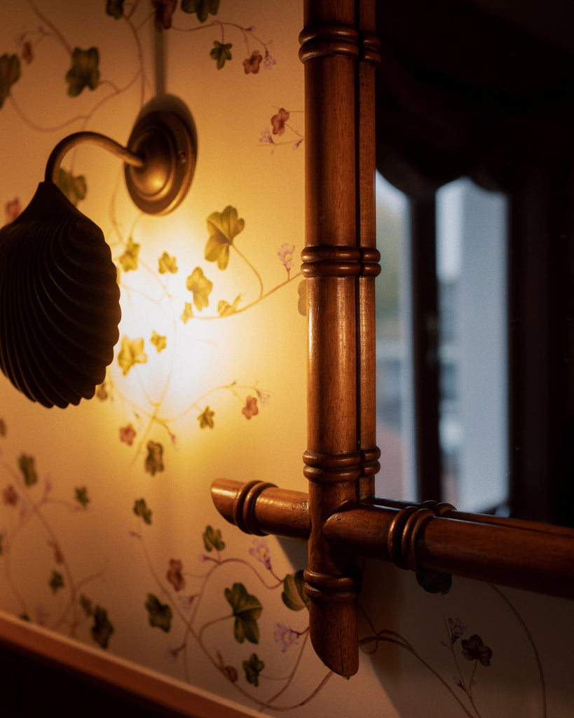 A traditional barber mirror, handcrafted in faux-bamboo by our talented artisans. A beautiful, warm addition to your hallway, bedroom or bathroom.