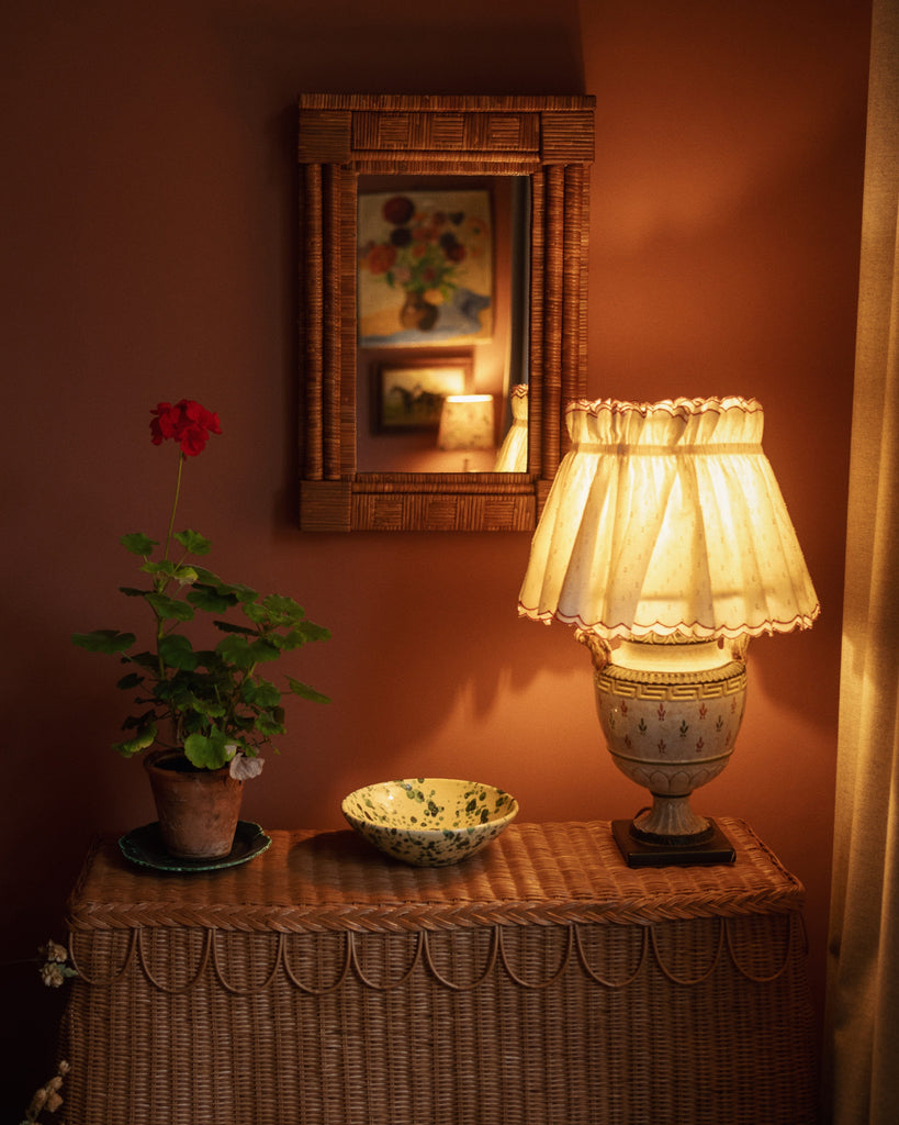 An elegant handmade mirror featuring rattan columns, this piece would look beautiful in the every room at home, from the entryway to the bedroom, bathroom or dressing room.