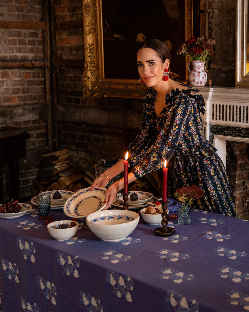 Inspired by a vintage Suzani, our Fraises Des Bois collection features an intricate hand-blocked strawberries motif layered with hand-cross-stitching. The borders feature a whimsical ruffle, and the whole thing is made from custom hand-loomed linen. This is artisanal work at its finest, and we hope you love the beautiful centrepiece on your table. The Fraises Des Bois tablecloth comes in three colourways: Cornflower Blue, Dusky Pink and Crisp White; all are available with matching ruffled napkins.